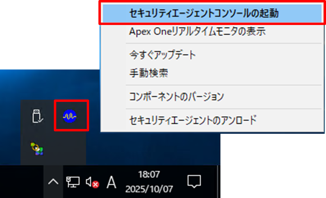 ①タスクトレイ内のApexOneセキュリティエージェントのアイコンを右クリックし、