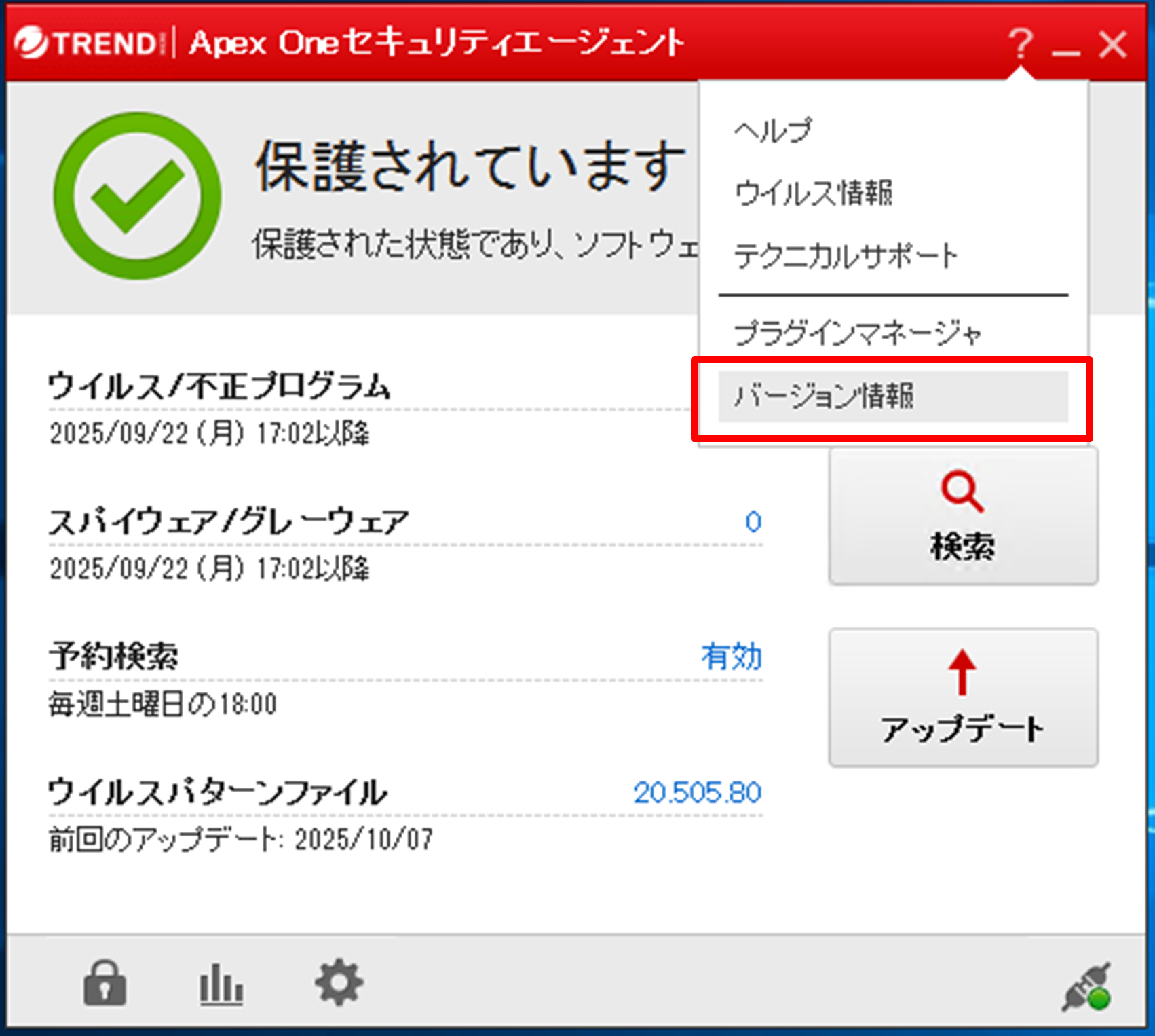②[ApexOneセキュリティエージェント]画面右上の[?]マークをクリックし、[バージョン情報]を選択します。
