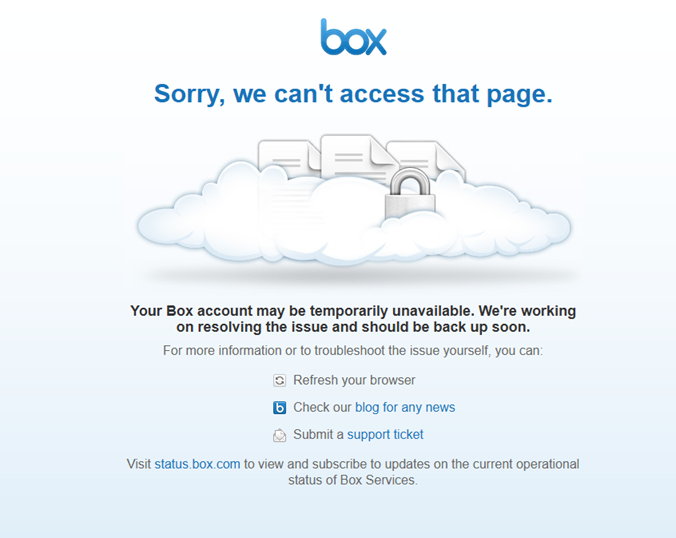 2025年12月17日10:00現在、クラウドストレージBoxを利用しようとした際にエラーメッセージが表示され、アクセスできない事象が発生しています。