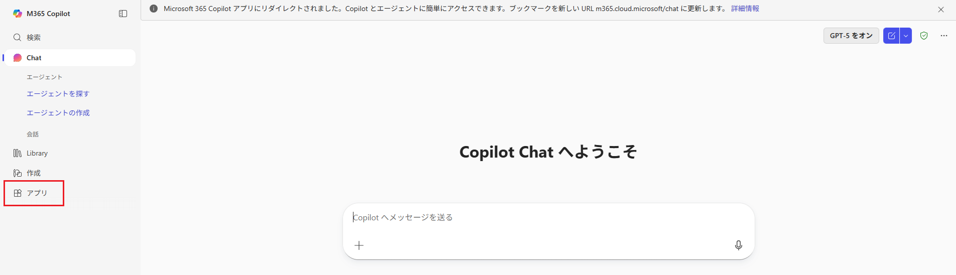 ①Microsoft365のログイン後、M365 Copilotが表示されるので画面から、「アプリ」をクリック