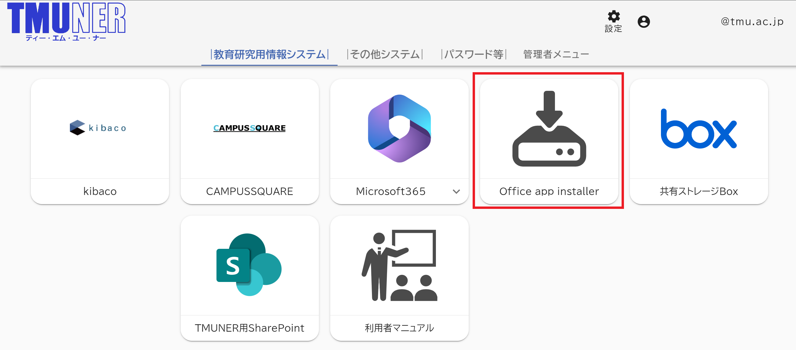 TMU IDをお持ちの方は、本学の設置組織である「東京都公立大学法人」が契約するMicrosoft365のソフトウェアライセンスが利用できます。利用者メニューにログインの上、Microsoft365ロゴをクリックすると利用できます。