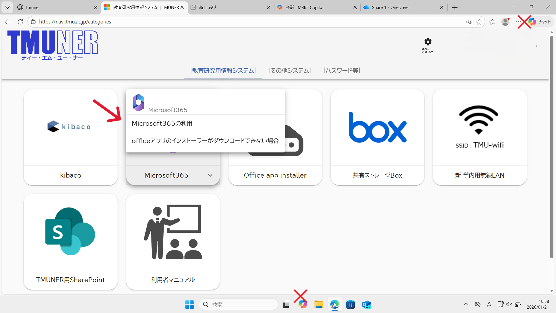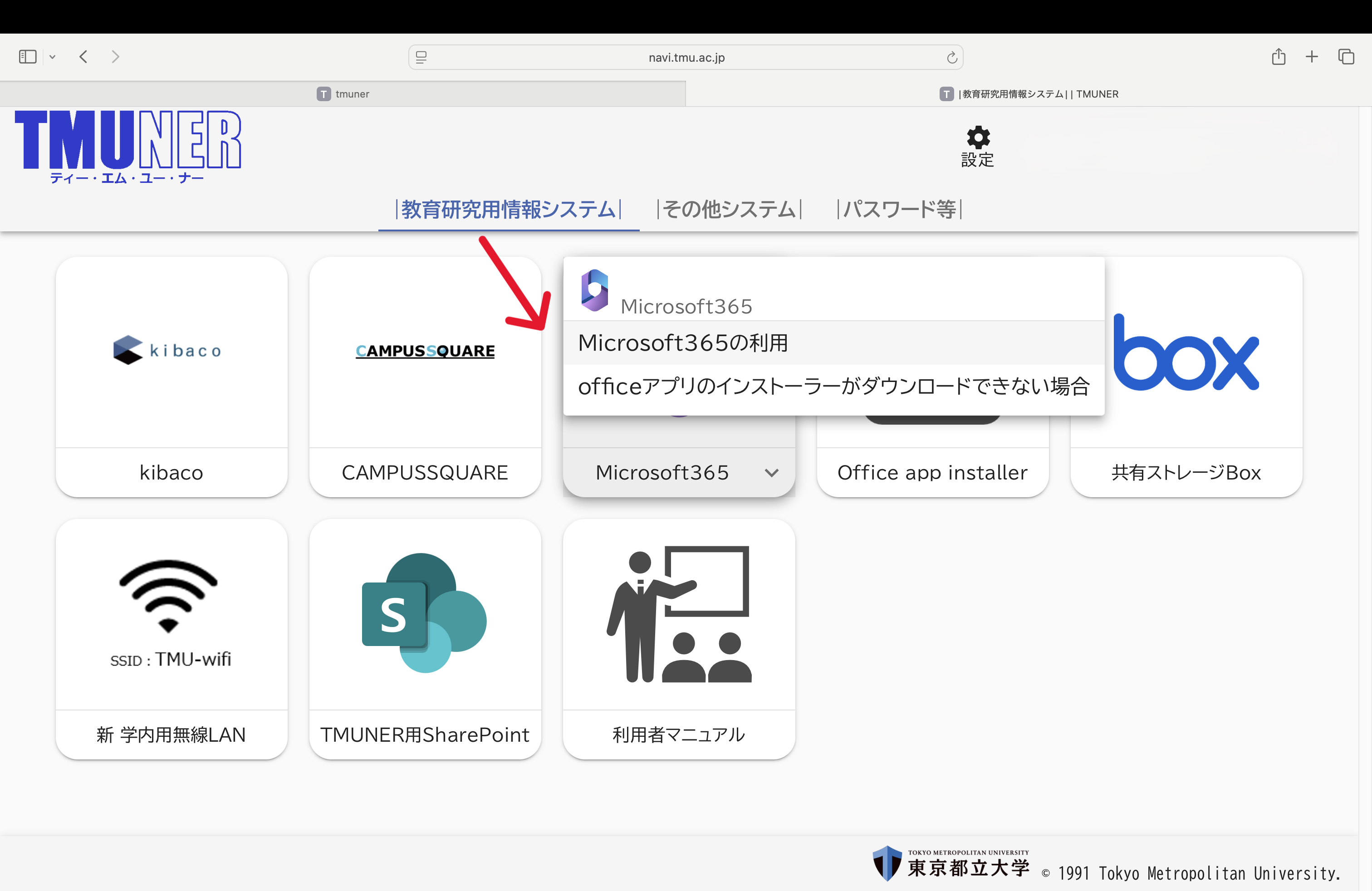 2.TMUNERの利用者メニューから“Microsoft 365の利用”をクリックしMicrosoft365トップページを開きます。