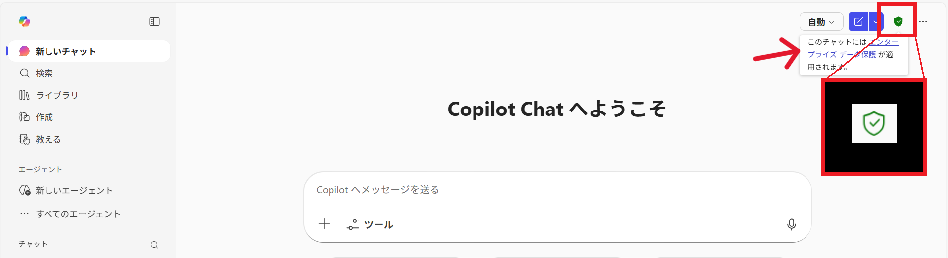 ・Copilot Chatには、画面の上部に、データ保護が適用されていることを示す、シールドのアイコン(下図) が表示されます。